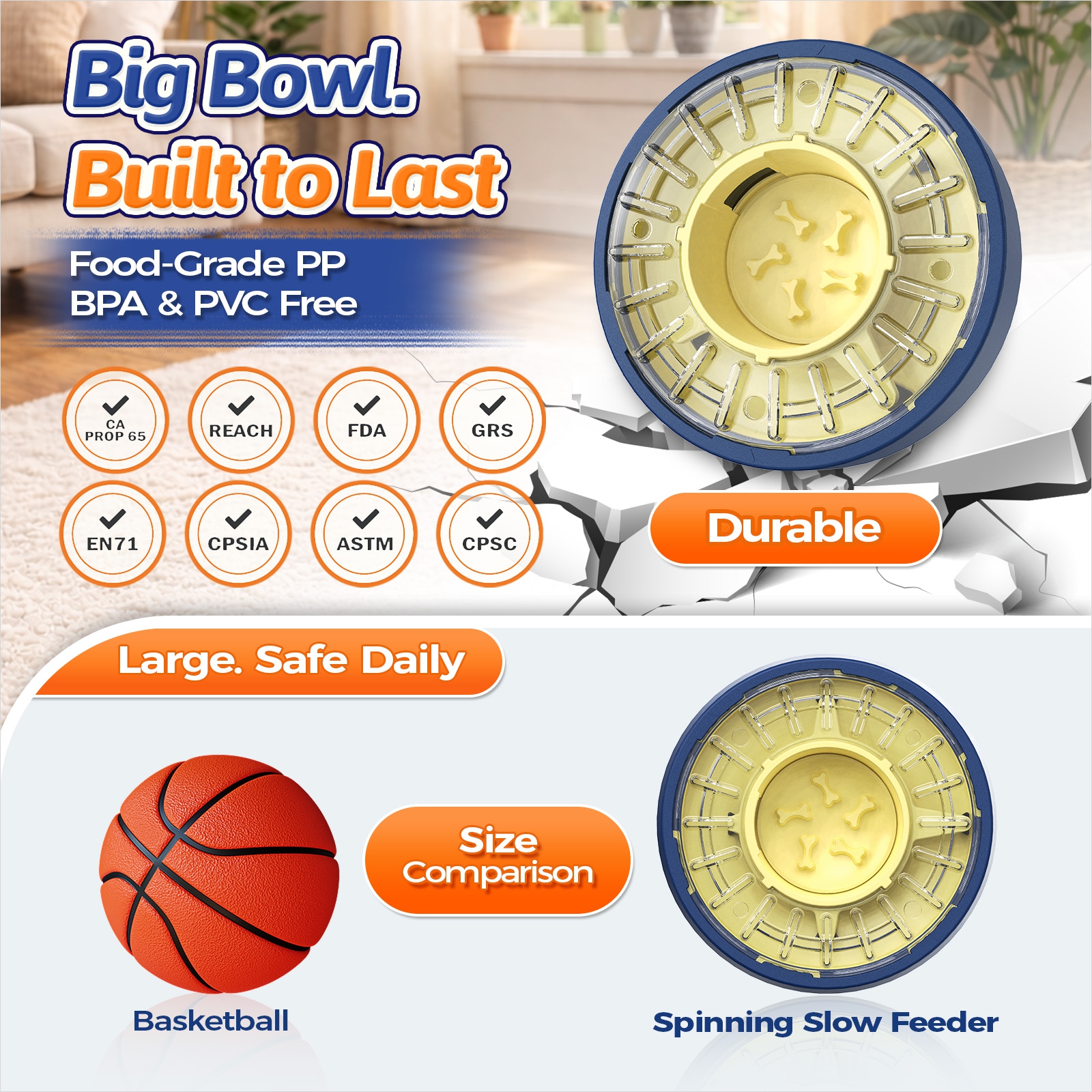 A: From KADTC, an American brand with a U.S. patented design, this is a spinning slow feeder dog bowl that turns meals into a work-for-food puzzle. Dogs paw or nudge the center to release food little by little.