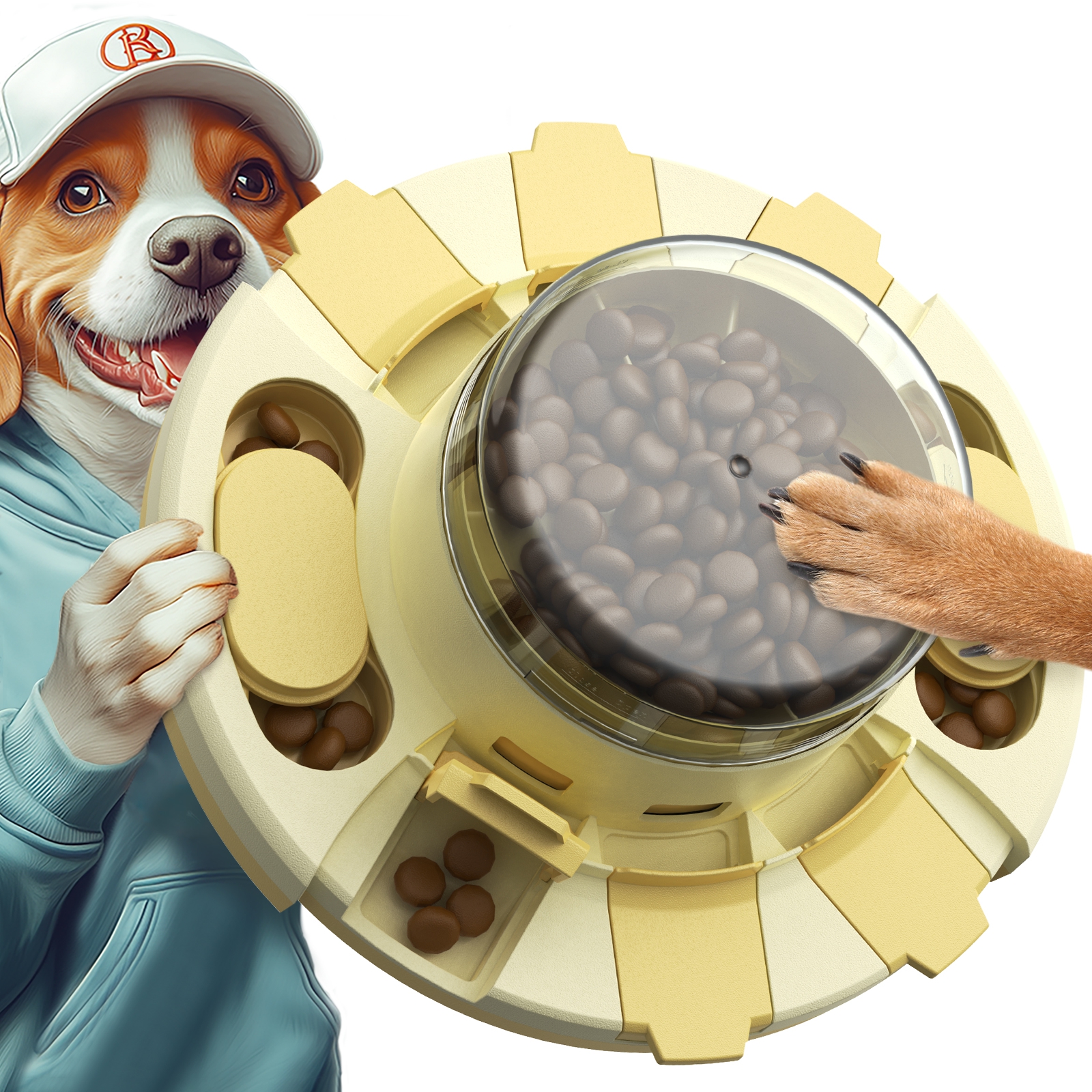 A: Fill the center, then your dog presses the clear top to drop food into the inner cups and continues solving for each reward.