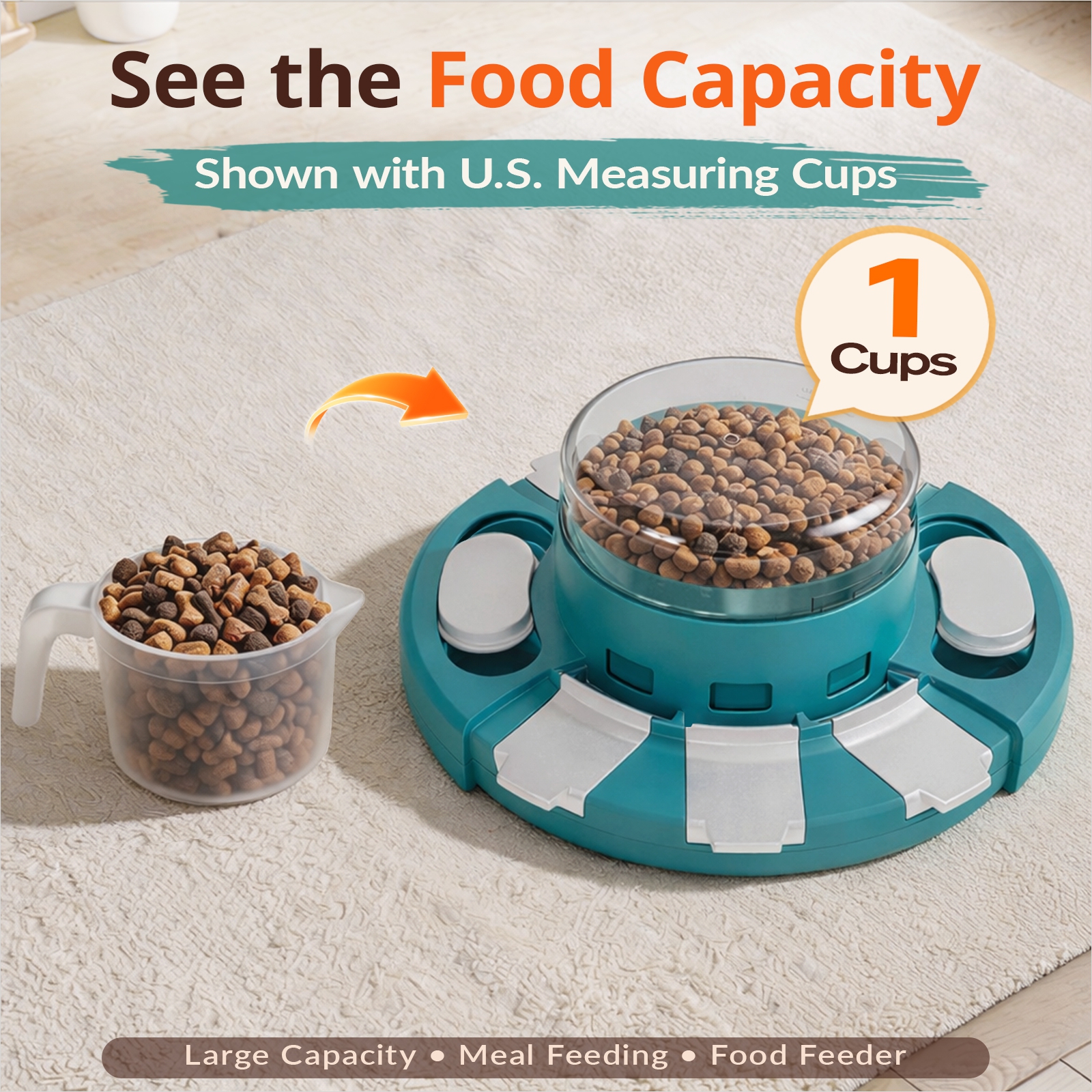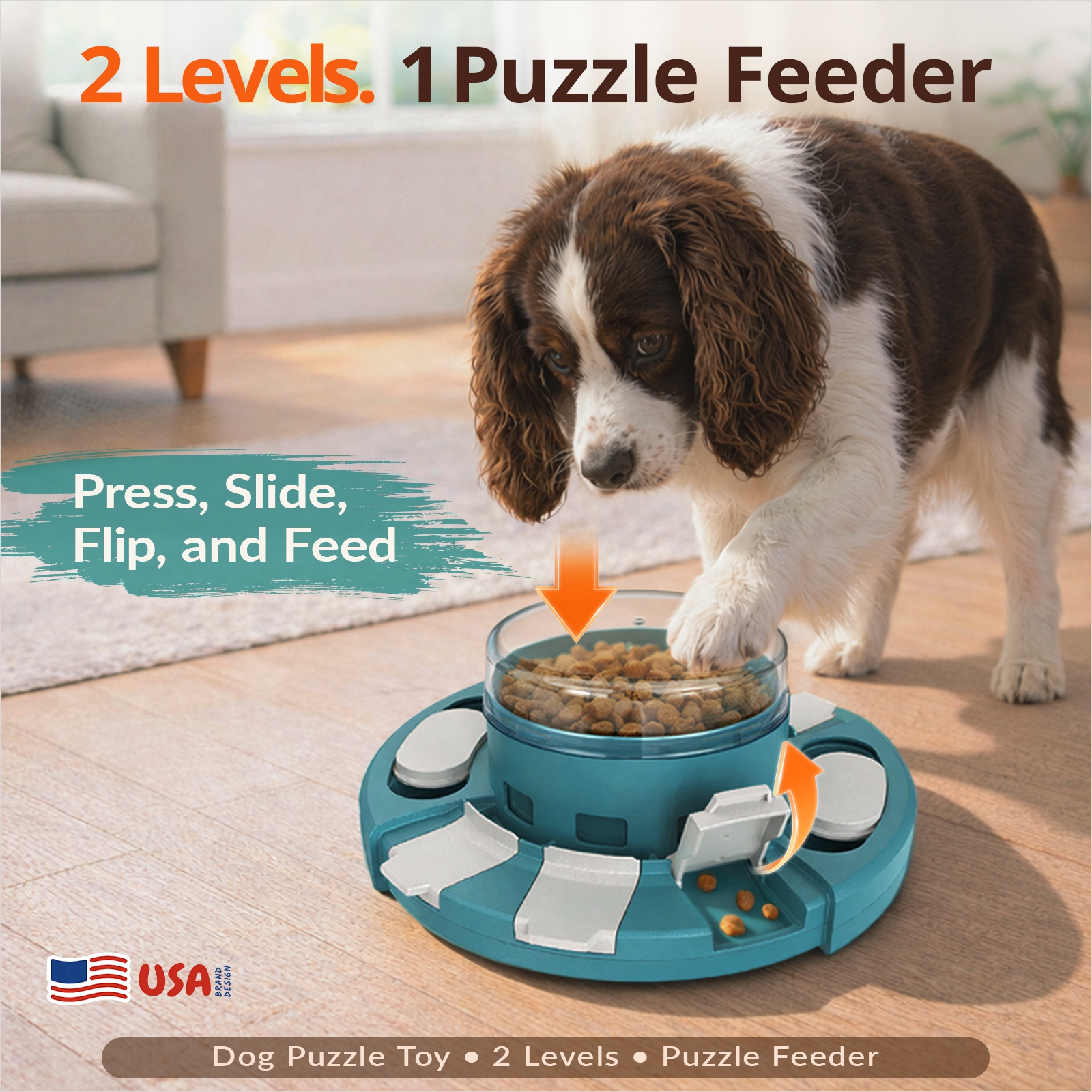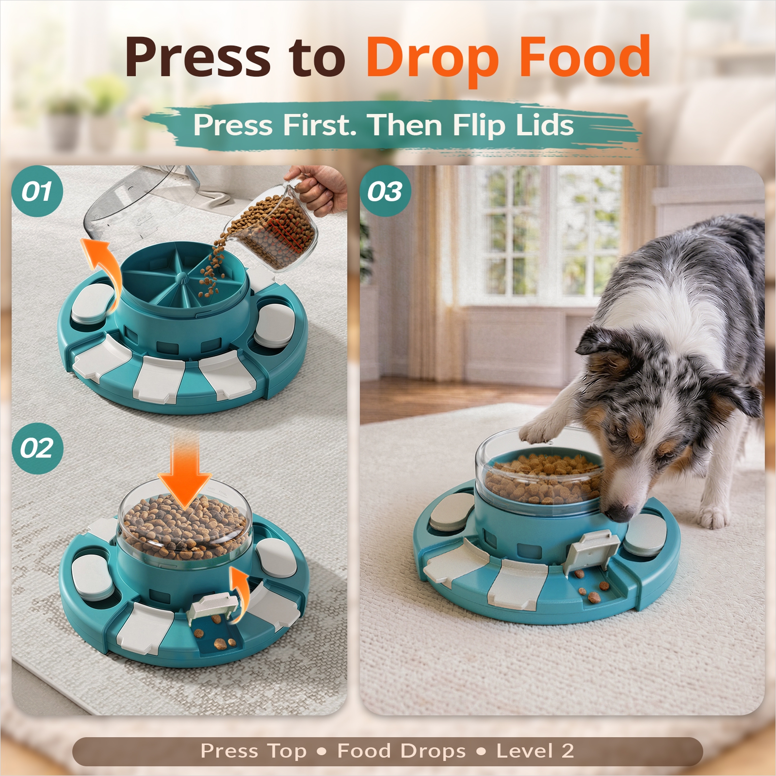 A: 6 flip lids + 2 sliding covers create a “sniff, paw, slide” routine that keeps dogs working.