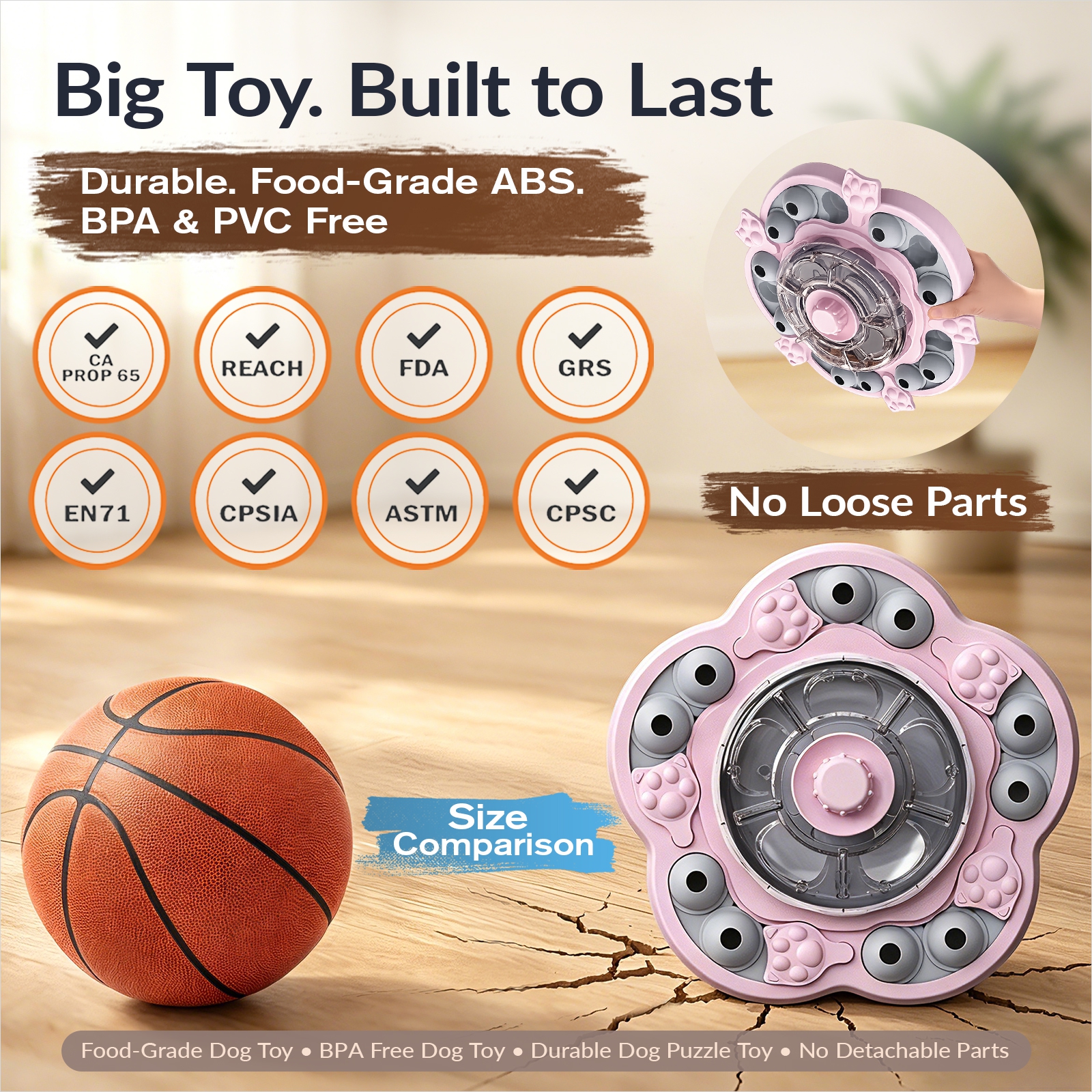 A: It’s made from food-grade ABS and formulated without BPA, PVC, or phthalates. The integrated main structure is designed to reduce loose game-piece handling and make everyday puzzle feeding feel more secure.