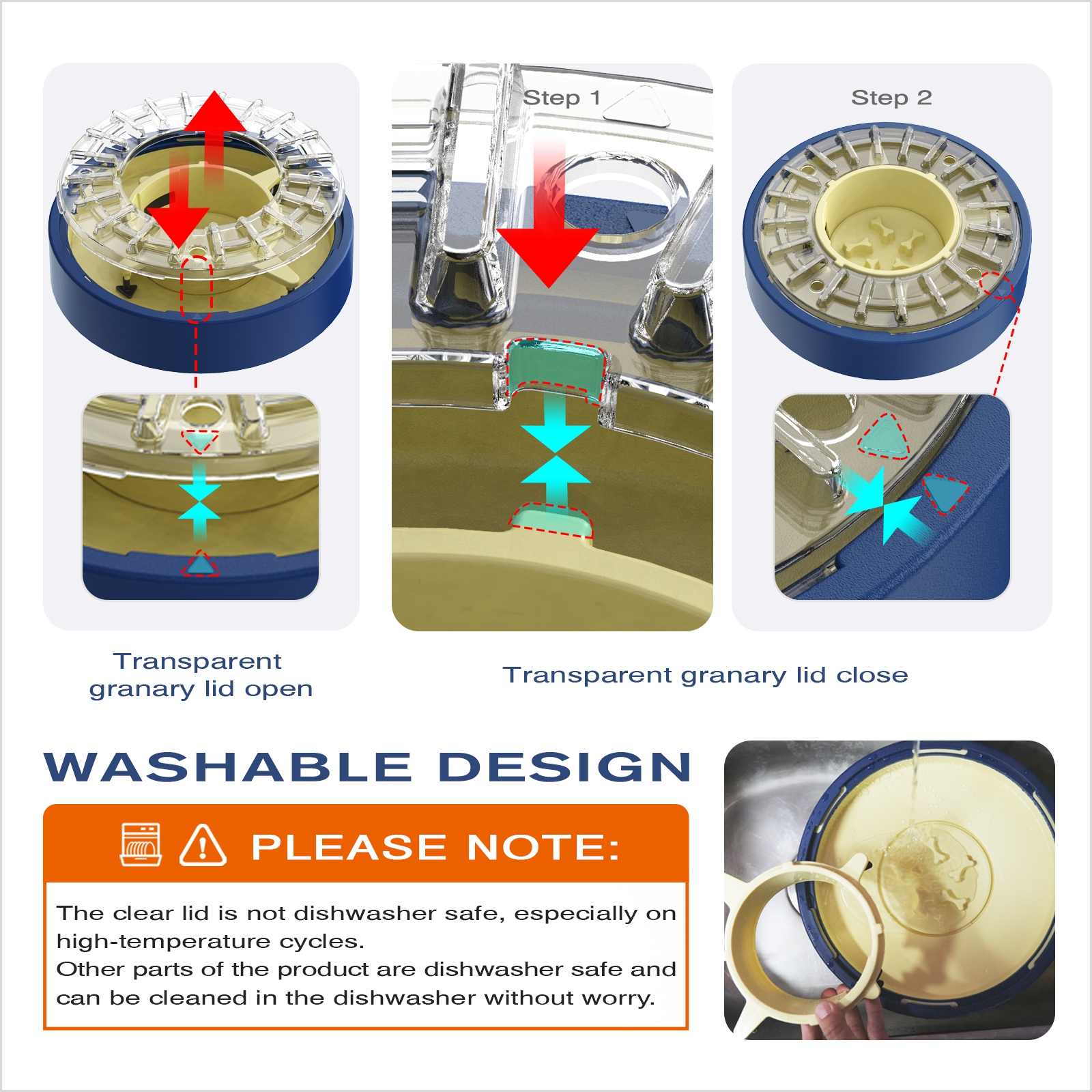 4 [Instructions for Use] Step 1: Please read the instruction manual carefully and learn how to open the transparent cover of the food container. Then, open this cover. Step 2: Add food to the container. Step 3: Dog can smell the food through the holes in the transparent cover, stimulating their instinct to search for food. Your dog can use their paws to move this transparent cover. Each time it is rotated, a small amount of food will be dispensed. As your dog continues to rotate the transparent cover, food will continue to be dispensed to the center of the product;