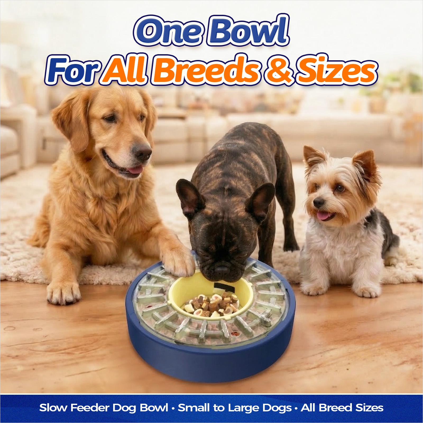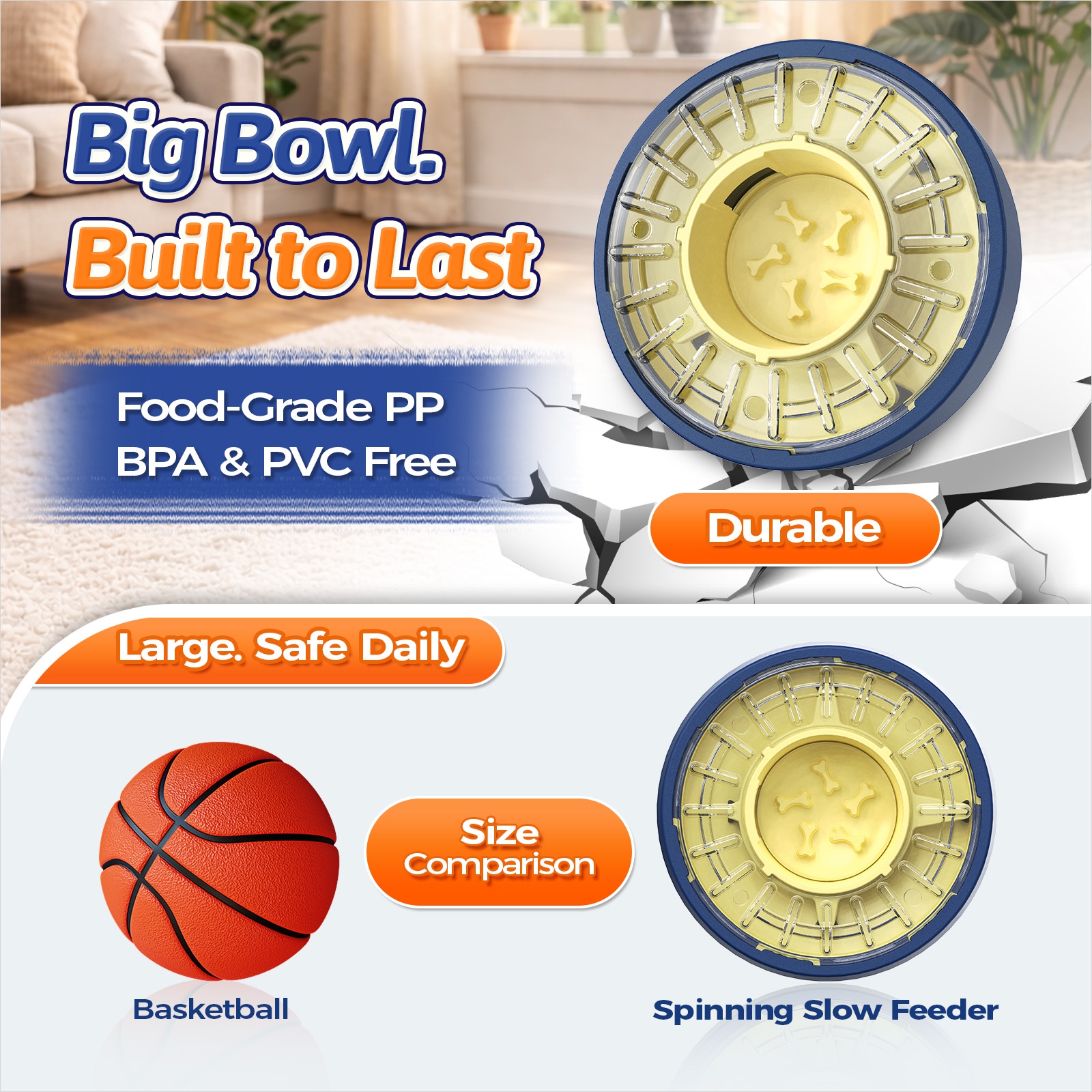 A: From KADTC, an American brand with a U.S. patented design, this is a spinning slow feeder dog bowl that turns meals into a work-for-food puzzle. Dogs paw or nudge the center to release food little by little.