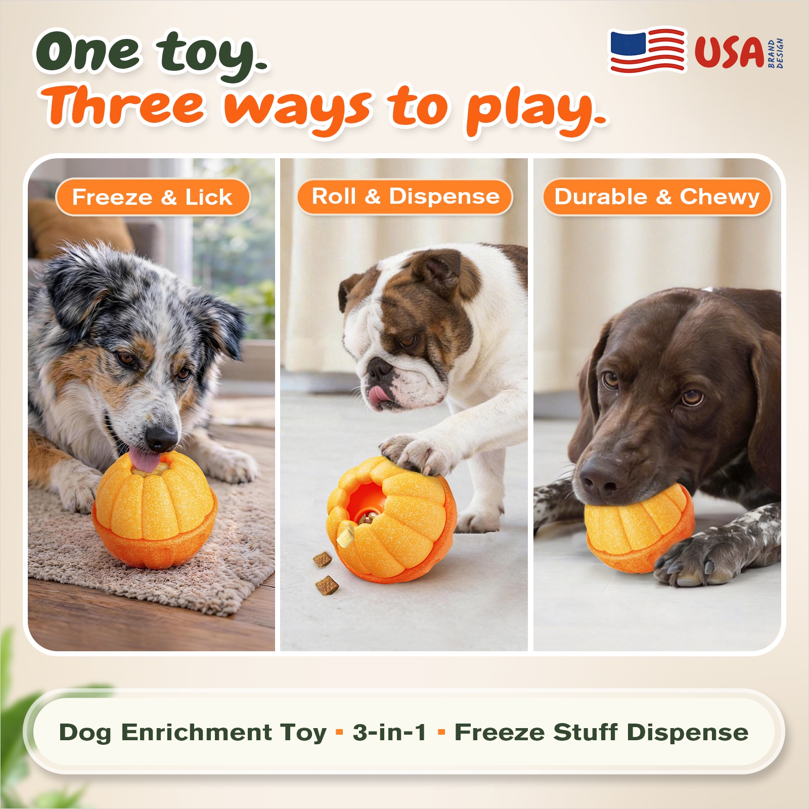 A: From KADTC (American pet brand) with a U.S.-patented concept, it’s Chew + Freeze & Lick + Roll-to-Dispense in one toy.