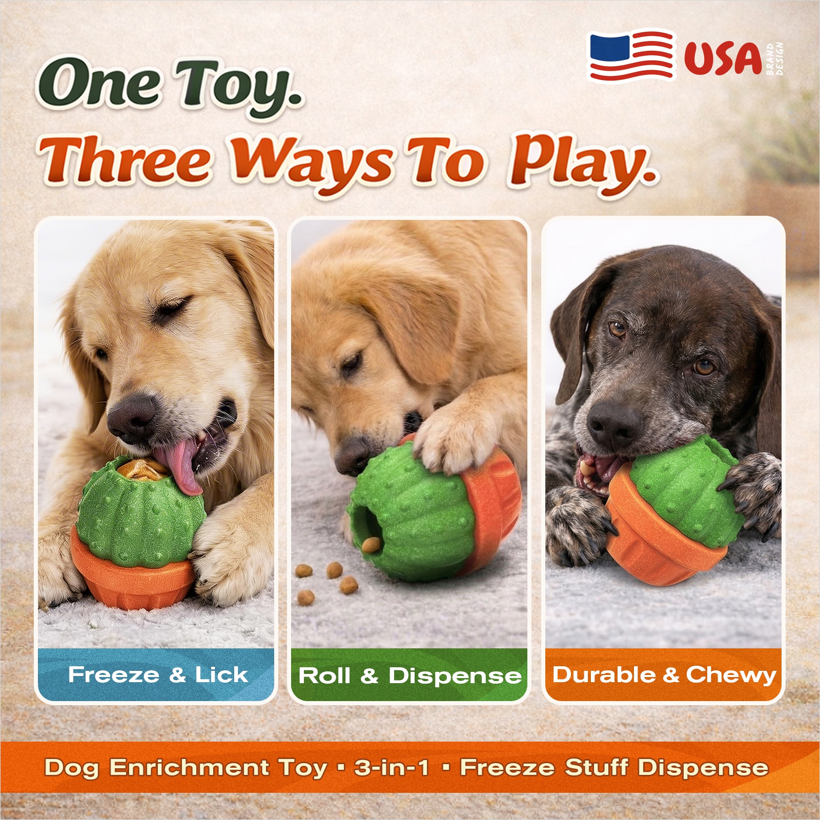 A: From KADTC (American pet brand) with a U.S.-patented concept, it’s Chew + Freeze & Lick + Roll-to-Dispense in one toy.