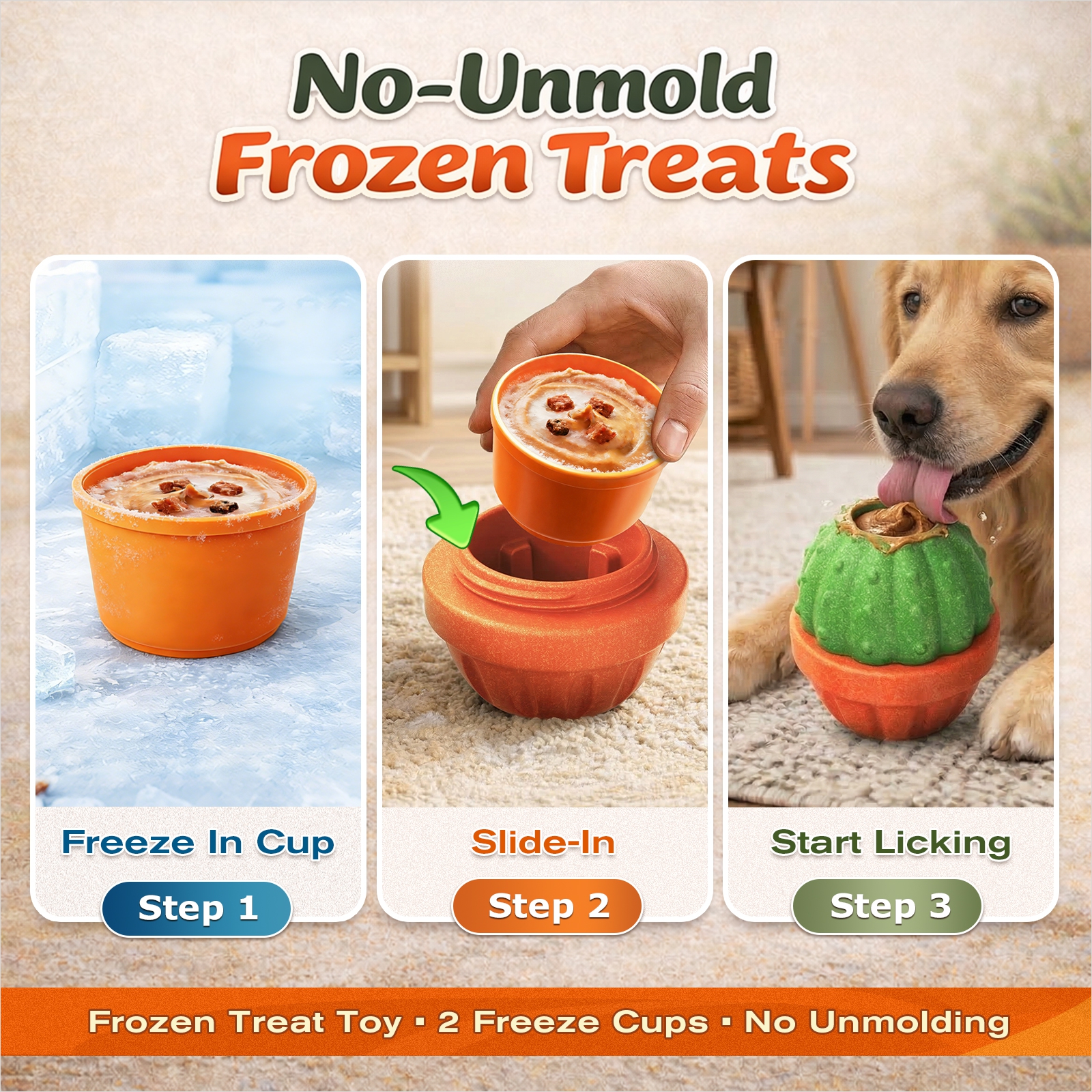 A: Fill the freeze cup with yogurt/peanut butter/puree, freeze, then slide the cup into the toy for a long licking session.