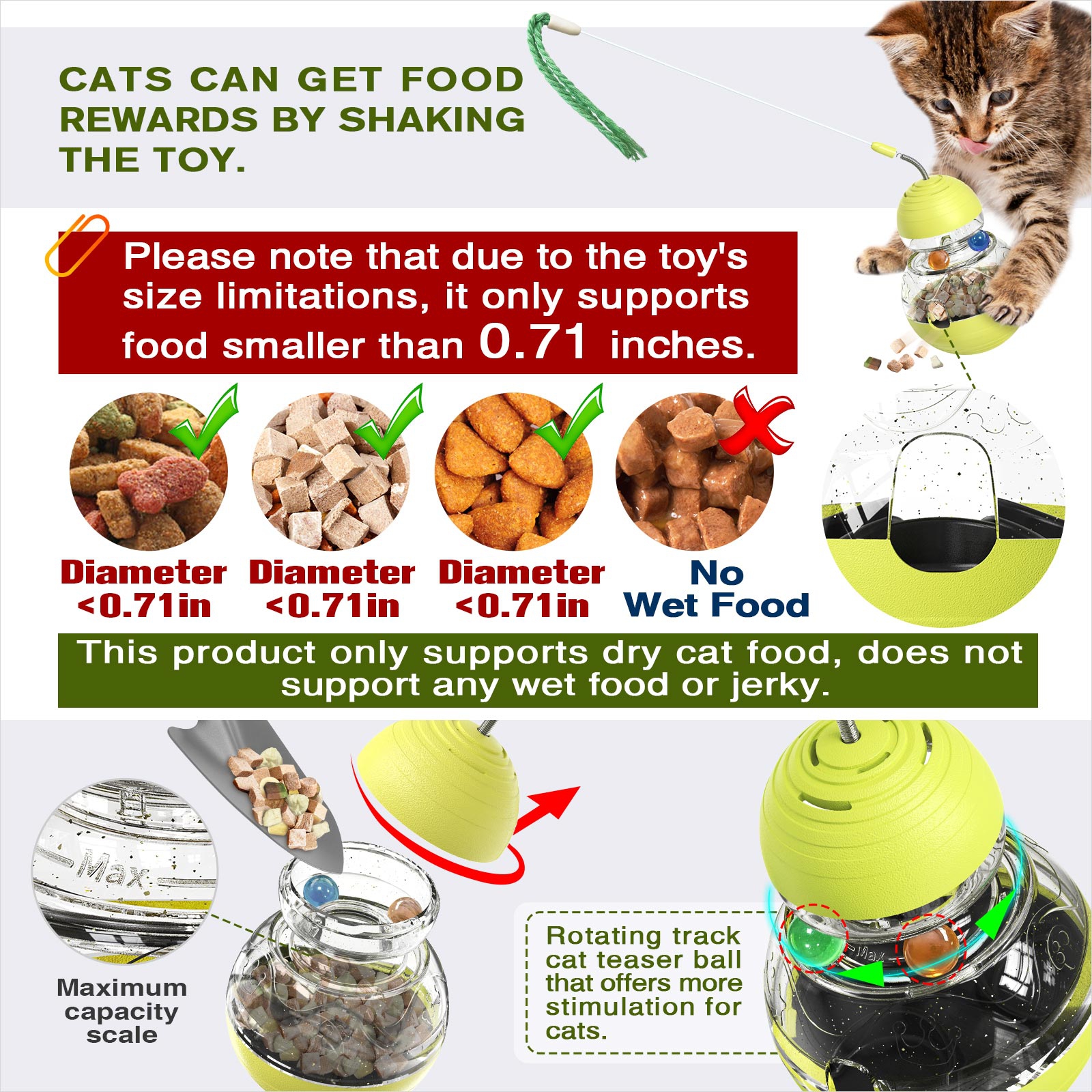 4 [Slow Food Dispensing Cat Toy]This product features a slow food dispensing function. You can rotate and unscrew the top cover to directly fill the main body with cat food (please note that this product only supports dry cat food and does not support any wet food or jerky). Cat just needs to gently shake the toy to get a food reward, adding to the toy's enjoyment. As your cat learns to use this toy, it also becomes smarter in the process;