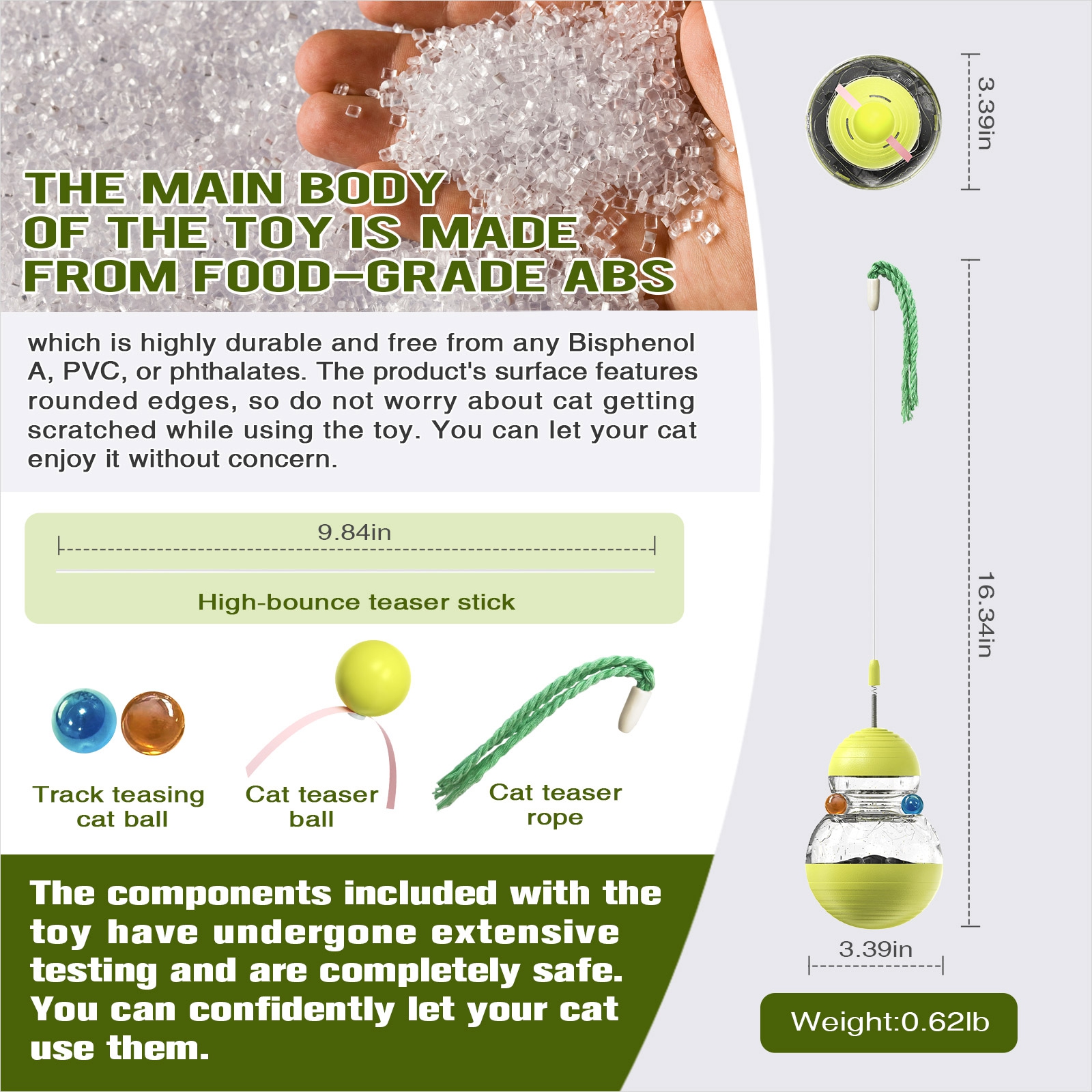 6 [Safe Material and Design]The toy's main body is made from food-grade ABS, ensuring its durability. It contains no bisphenol A, PVC, or phthalates. The product's surface is designed with rounded edges, so you don't need to worry about your cat getting scratched during play. Both the raw materials and the product itself are very safe, allowing you to use it for your cat without concern;