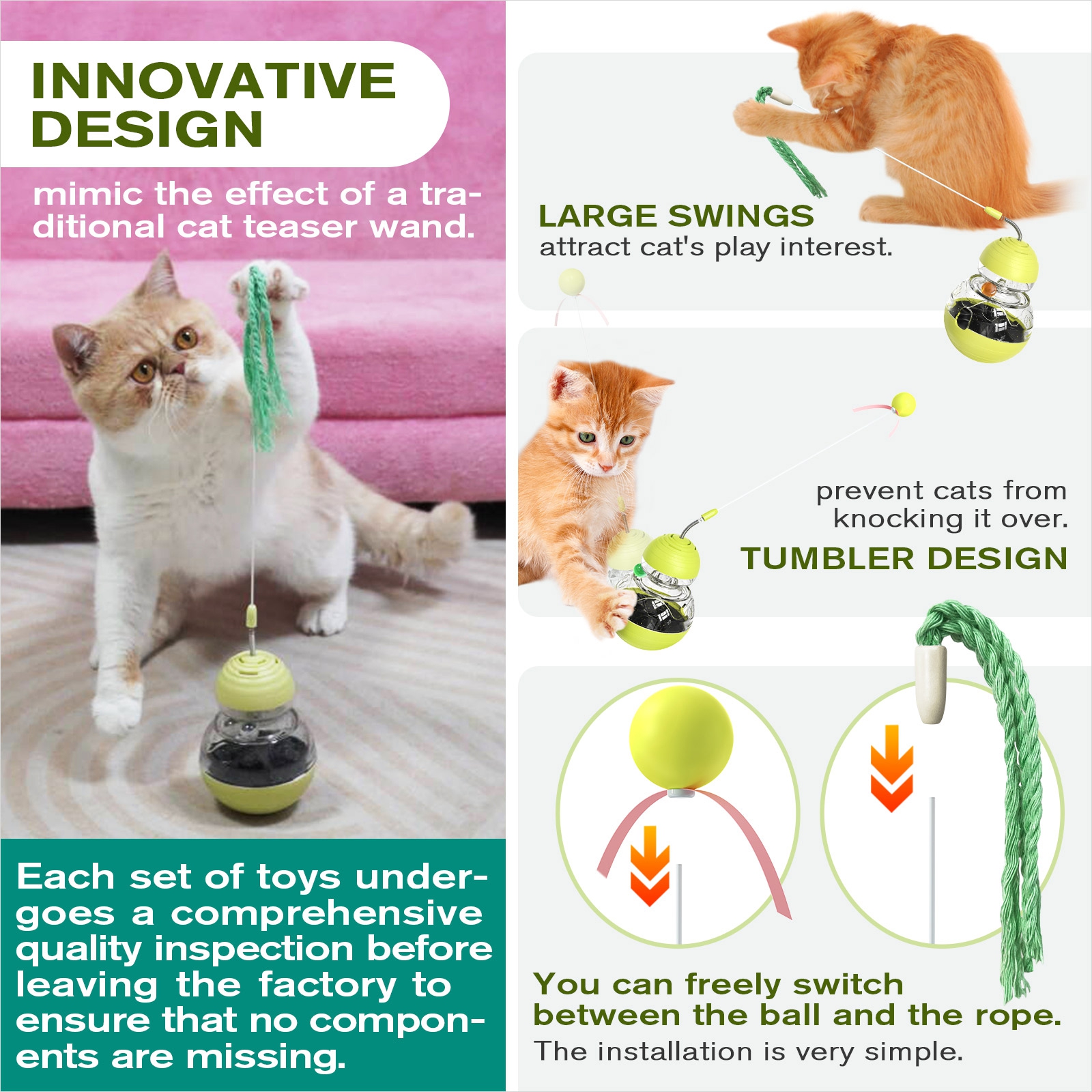 1 [Multi-functional Indoor Interactive Cat Toy]This toy combines multiple entertaining elements, making it highly appealing to cats. It features a tumbler design, a high elasticity teaser wand, a swinging food dispenser, a lighting ball, and a trackball, providing various functions;