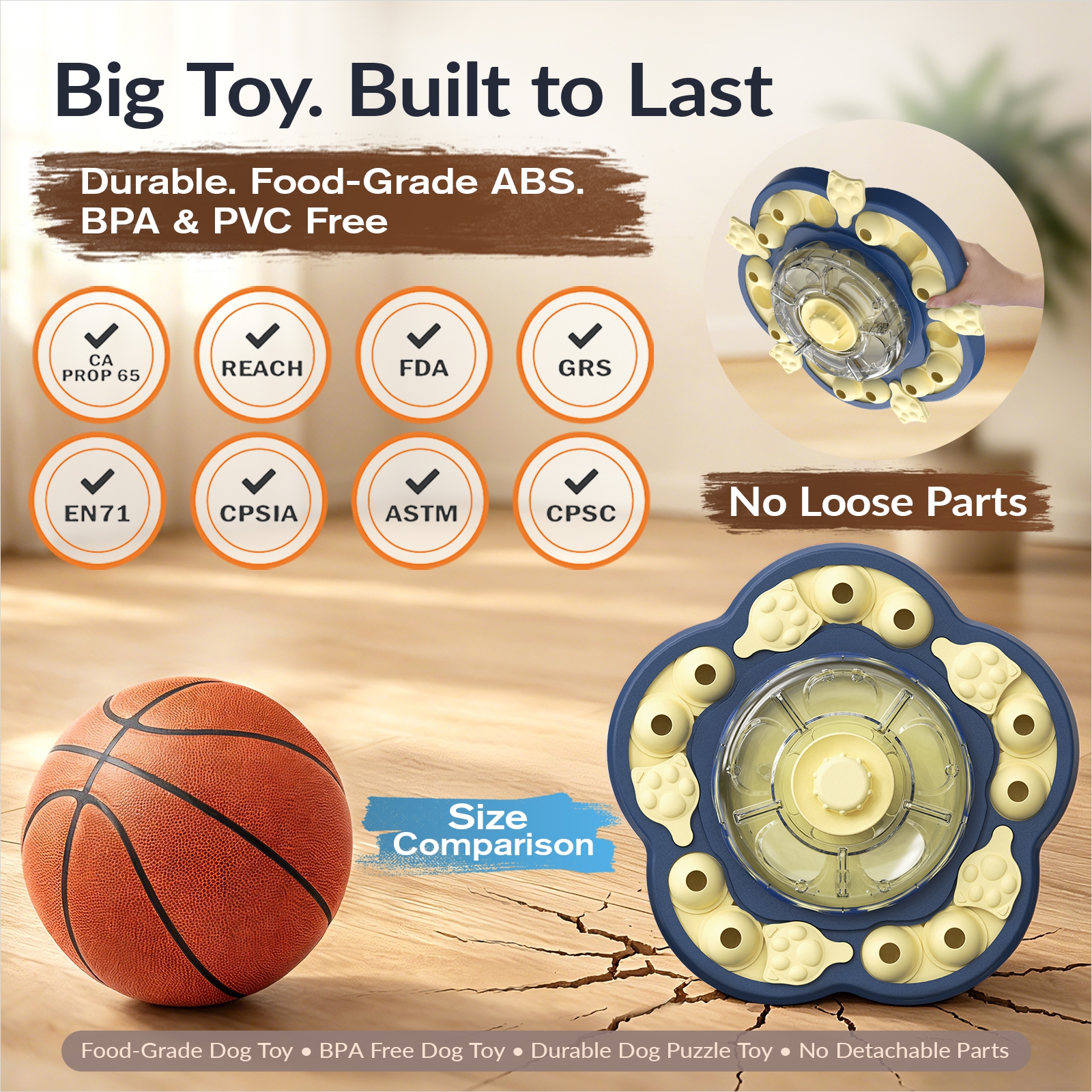 A: It’s made from food-grade ABS and formulated without BPA, PVC, or phthalates. The integrated main structure is designed to reduce loose game-piece handling and make everyday puzzle feeding feel more secure.