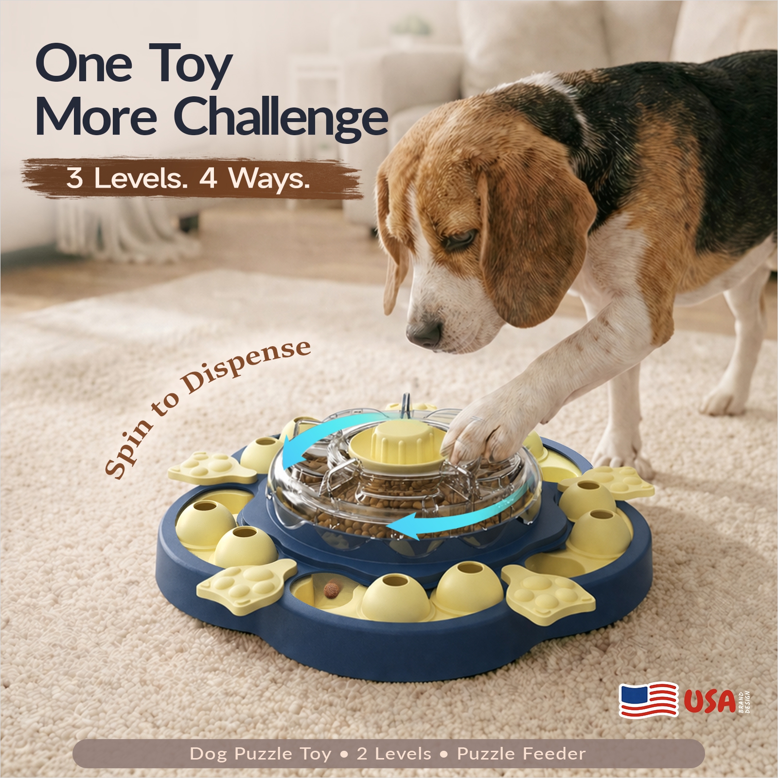 A: From KADTC, an American brand with a U.S. patented design, this is a vertical dog puzzle toy + slow feeder that combines 3 difficulty levels and 4 ways to play in one system. Dogs spin the center to drop rewards, then slide and solve for kibble or treats.