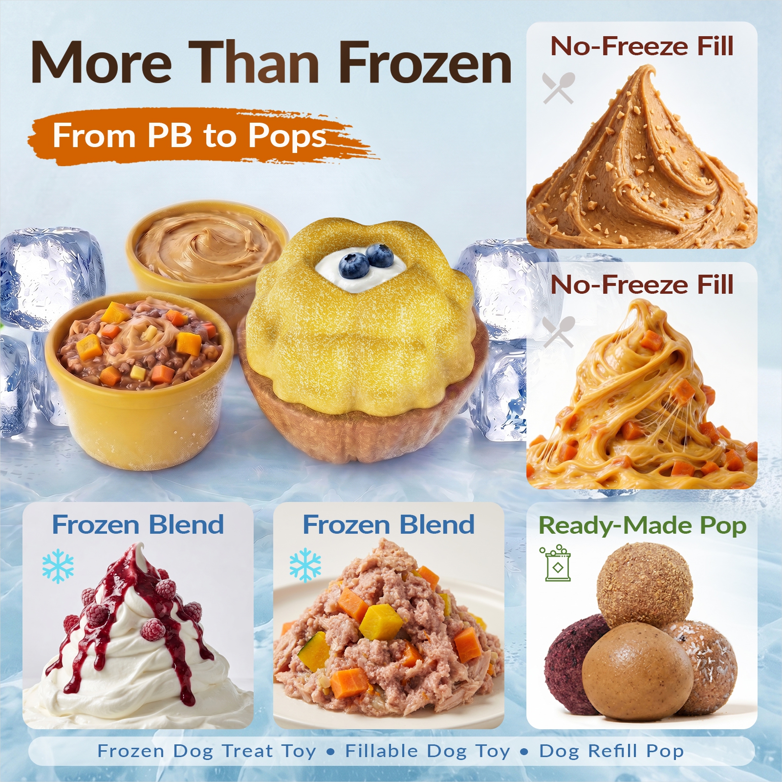 Fill the included freezer cups with peanut butter, yogurt, pumpkin, broth, puree, or your own recipe, freeze ahead, and insert them straight into the toy—no messy unmolding. It’s a cleaner, easier way to create a longer-lasting lick session that keeps dogs focused and happily busy.
